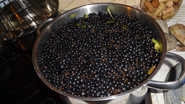 Ich habe ein Kilo Ligusterbeeren von meiner Schwester bekommen und noch ein zweites Kilo bei meinem Bruder dazu gesammelt. Nun bin ich mal wieder am köcheln. Die erste Wolle habe ich mit Essigessenz gebeizt. Ich bin einmal mehr etwas unschlüssig, ob das, was ich da veranstalte, was wird. Also habe ich nochmal eine sanfte Alaunbeize angesetzt und wollte ein paar kardierte Vliese überfärben, wo mir die Farbe nicht so gefallen hat. Lustigerweise sind diese in der Beize in ihrer Farbe richtig intensiv geworden, so dass sie nun nicht überfärbt werden. Ich habe ein paar andere Vliese gefunden, die fast farblos sind. Nun köcheln sie vor sich hin. es bleibt abzuwarten, wie diese beiden Färbungen werden. Es kann ein Weilchen dauern.